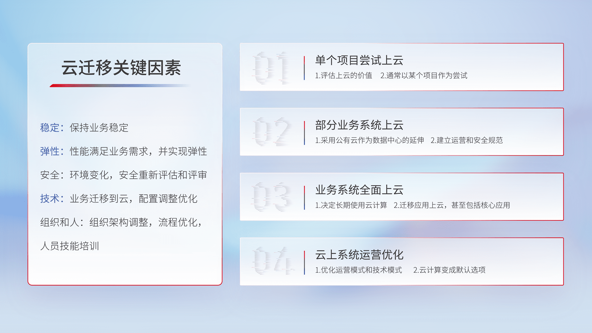 结合实际业务,,,从规划设计、、、云平台选型、、、云原生改造、、、、数据迁移、、集成交付,,迁移全过程为客户识别最佳上云路径,,,做好风险识别管理,,,,设计网络架构、、、身份权限、、、安全审计合规、、操作审计、、、、日志审计、、、监控告警策略、、、多站点容灾设计等,,,对云上基础设施进行整体规划,,,提升IT治理水平,,以满足弹性、、、、高可用、、、、高性能的需求。。。