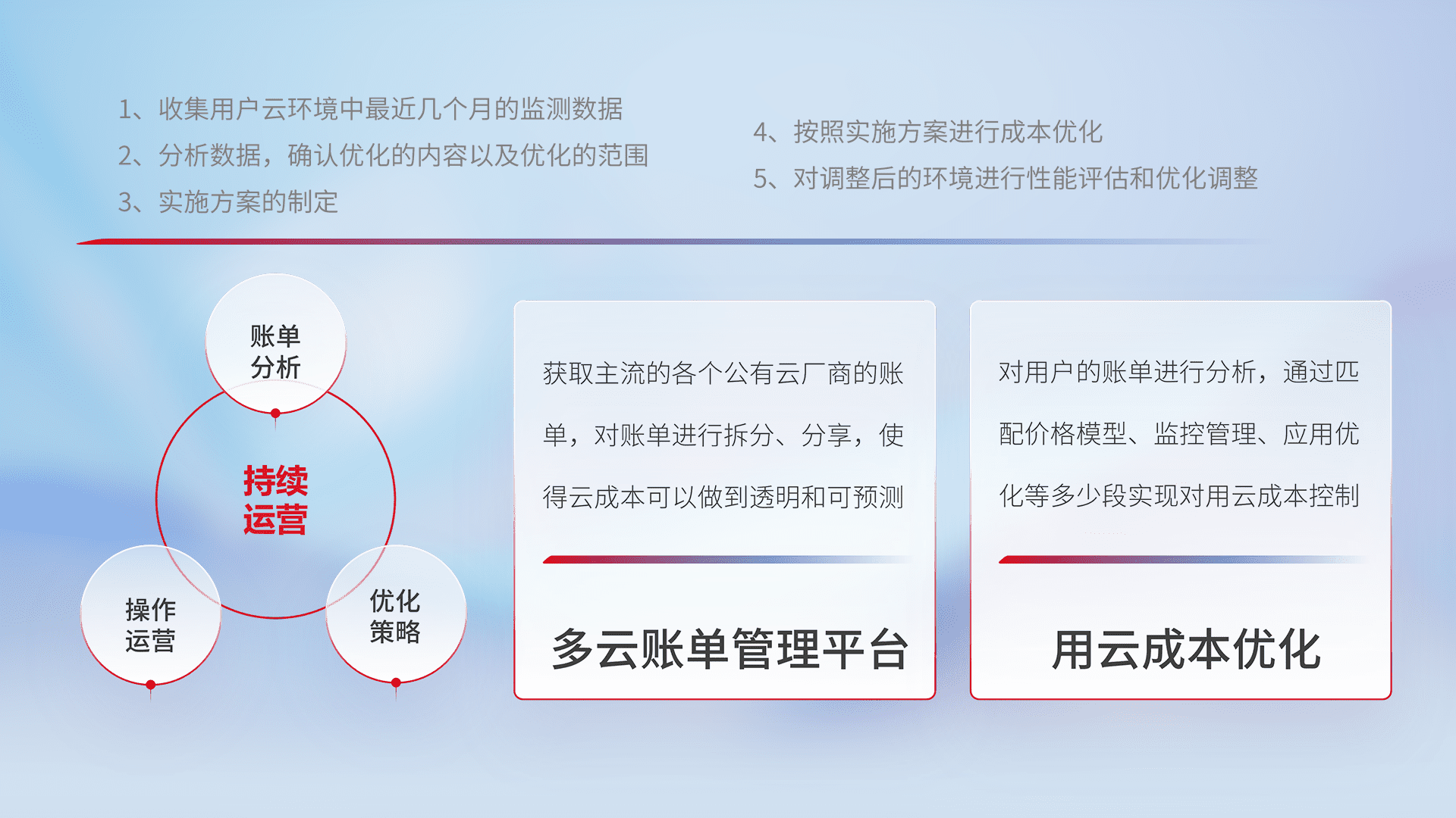 通过多云纳管,,,,以统一的资源数据模型把客户的云资源进行抽象和封装,,,,进而实现对多云资源的统一操作,,,,保障云资源管理的可靠性、、、稳定性与可用性。。量身定制化运维内容,,,配置、、、开发运维、、、补丁管理、、、、备份、、监控、、认证和访问管理、、审计和日常巡检等,,保障在用云过程中的可靠度,,,,稳定度以及高可用率。。。。