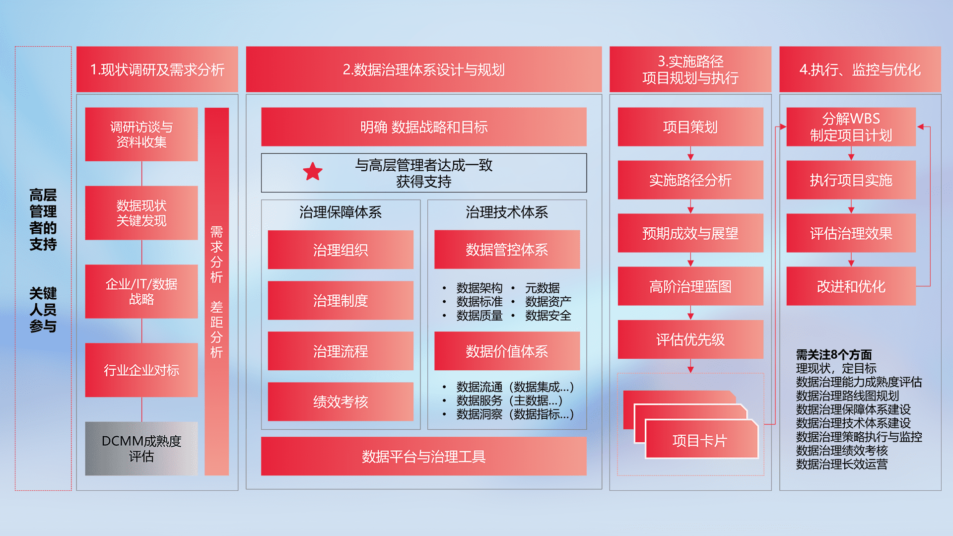 制定并执行统一的数据标准,,,规范数据定义和格式,,,消除冗余和不一致性,,,实现跨部门和跨系统的数据一致性,,,为企业提供标准化的数据基础。。